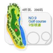 9号洞:很多高尔夫球场设计师把最后的两三个洞设计得比较难,最后一个洞难度最大,从而创造或是大败,或是大胜的戏剧性效果。它是一个距离仅有374码的4杆洞。这个洞景观丰实,障碍丛生。站在超过转点处40米的高高在上的发球台上,为你营造一个胜利者姿态的环境,发球台在此选在高高的山坡,俯视两边自然山体包围着的峡谷球道,球道一路向下直线延伸,直达果岭。只要你有效避开仅有19米宽的转点落球区、小溪、水塘与环绕果岭的沙坑,两杆攻上果岭,两杆将球推进洞是不会有悬念的。 |